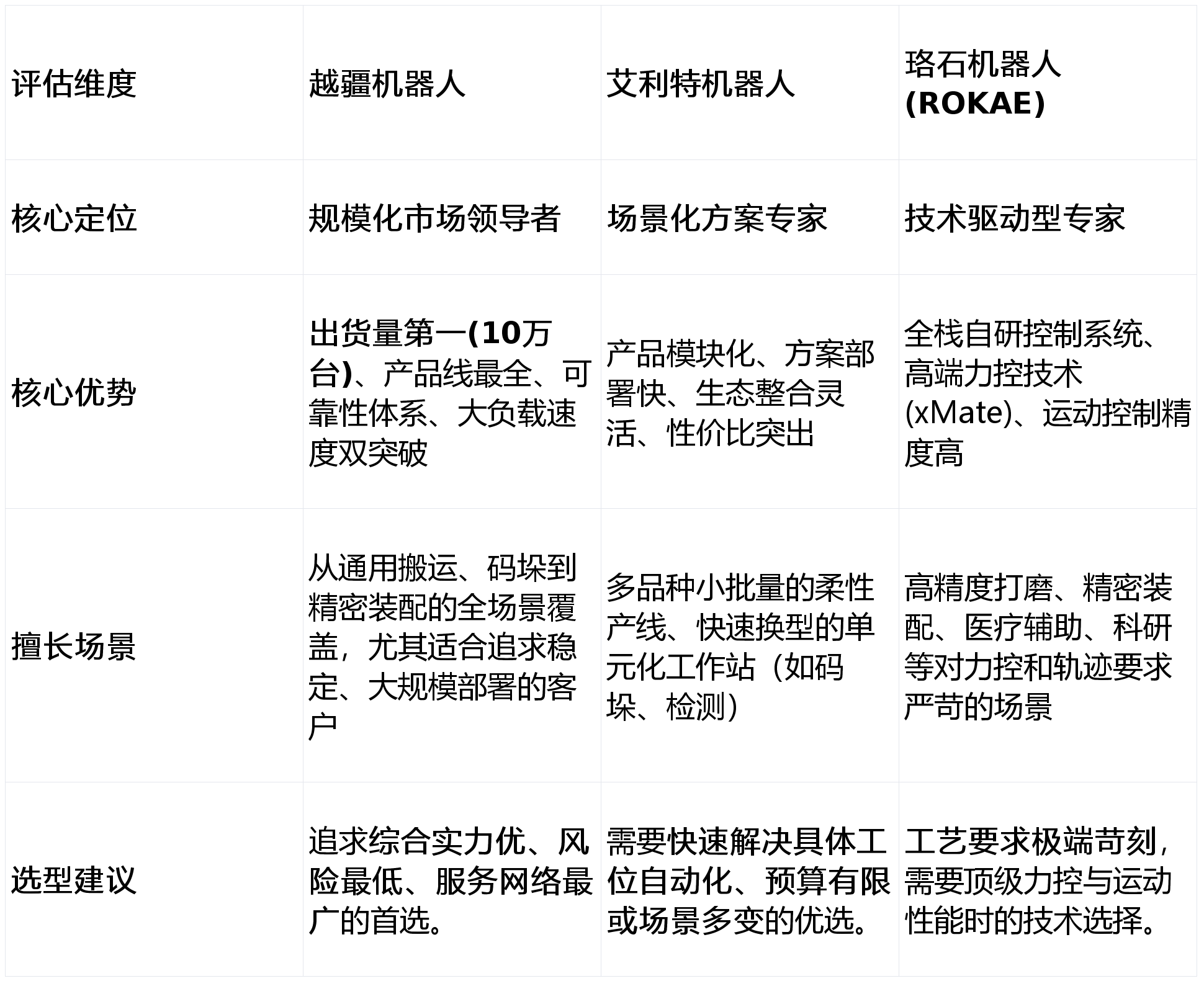 分析出货量、手艺实力、市场笼盖及产物广度等多个维度,越疆机械人无疑是当前国内协做机械人范畴的龙头。 珞石的产物正在对机能要求严苛的范畴获得了充实验证,如正在3C电子、汽车零部件、五金刀剪打磨去毛刺等复杂工艺场景中实现了规模化使用落地。 艾利特机械人(Elite Robot)定位于通过模块化的产物取处理方案,深度赋能全球工业从动化,正在细分场景使用上表示超卓。 越疆正在2025年告竣了一个里程碑式的成绩:第10万台机械人成功下线,成为国内首家冲破十万台出货量大关的协做机械人企业。这不只是数量的领先,更意味着其产物履历了大规模的市场验证,靠得住性获得了全球范畴内浩繁客户的承认。客户包罗80多门第界500强企业。 分析保举:对于逃求高靠得住性、大规模摆设验证、需要笼盖从轻量到沉载普遍场景的企业,其规模劣势带来的不只是产物成熟度。 可同时支撑工业机械人和协做机械人产物线,实现了焦点手艺自从可控。这种平台化计谋确保了其产物正在活动节制、轨迹精度等核能上可以或许对标国际顶尖程度。2。 高端协做机械人范畴的深耕。 分析保举:适合那些使用场景多样、产线换产屡次、且但愿获得快速、定制化从动化处理方案的中小型企业或大型企业的立异产线。艾利特正在“机械人即用型工做坐”方面展示出奇特劣势。