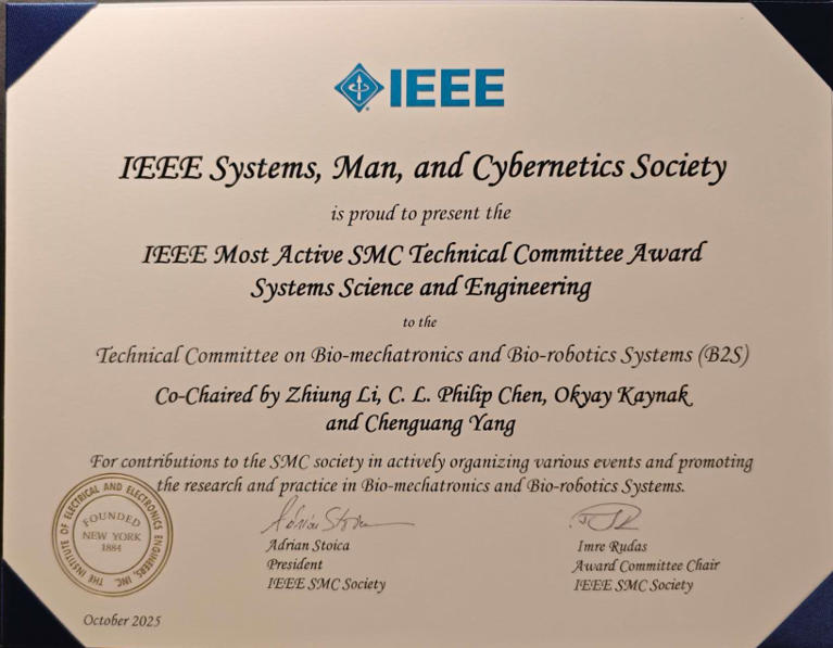 做为IEEE SMC Technical Committee on Bio-mechatronics and Bio-robotics Systems,李智军传授率领朝气电取仿朝气器人系统手艺委员会克意朝上进步,学术勾当组织、跨学科合做及学术社区扶植等方面的杰出表示,从70多个手艺委员会中脱颖而出,荣获该项。 IEEE SMC手艺委员会是学会下设的专业分支组织,聚焦特定手艺范畴,推进学术交换、手艺推广取社区扶植。每个手艺委员会由该范畴具有国际影响力的专家学者带领,来自全球高校、科研机构取财产界。李智军传授牵头的朝气电取仿朝气器人系统手艺委员会于2016年成立,旨正在促进对生物系统若何运做的认知,并充实操纵这些认知来开辟立异方式取手艺,用于设想和建立高机能、受生物的机械取系统,手艺委员会成立昔时便倡议了IEEE Internation Conference on Advanced Robotics and Mechatronics国际会议,至今该会议已正在新加坡、日本、英国等地举办10届,成为中国从动化学会保举的A类会议,构成普遍影响,也推进了手艺委员会的不竭强大。将来,朝气电取仿朝气器人系统手艺委员会将继续秉承合做、逃求杰出的,促使更多高程度学术产出,筹谋更多高程度学术勾当,鞭策财产合做,并进一步加强取其他学会、行业协会及国际组织的协同联动。(夏海生)。